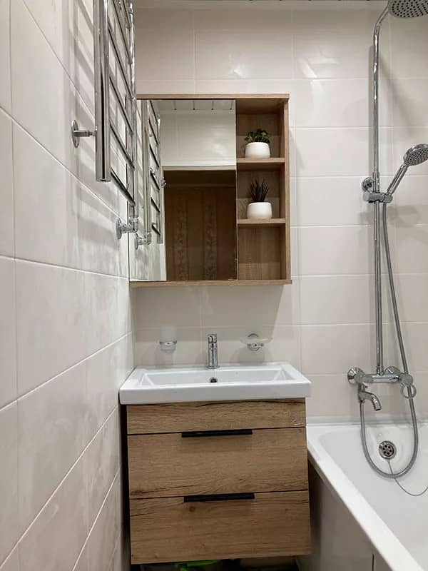 При капитальном ремонте ванной и туалета, наши мастера произвели весь необходимый комплекс работ, которые включали в себя демонтаж старой сантехники, прокладку труб, монтаж новой инсталляции, облицовку стен и пола керамической плиткой, а также монтаж новой сантехники и установку светильников. В результате проделанных работ, ванная и туалет выглядят стильно и аккуратно.