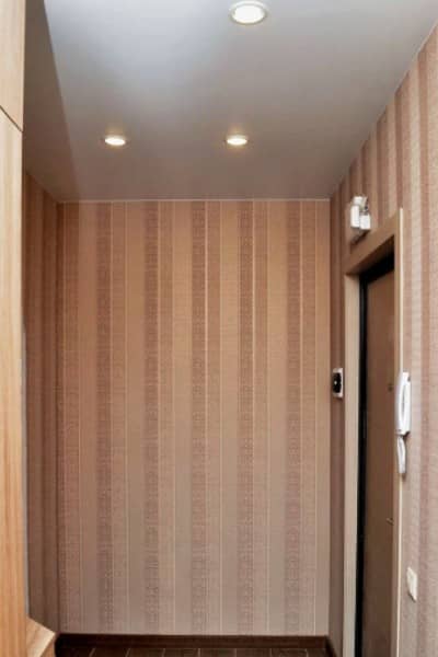 - Установка натяжных потолков на кухне и в коридоре с точечными светильниками.