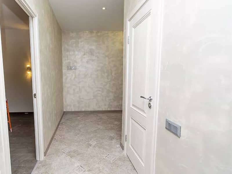 - Стены были окрашены, в коридоре-прихожей использовалась декоративная штукатурка с текстурой камня шелка.