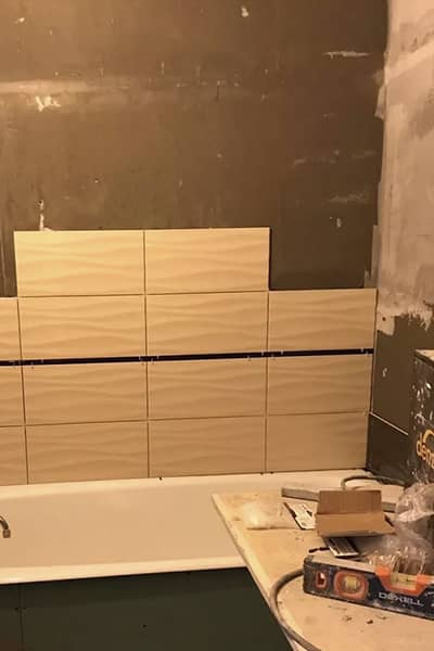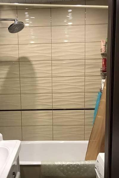 - Укладка плитки на стены с тщательной подгонкой и затиркой швов.