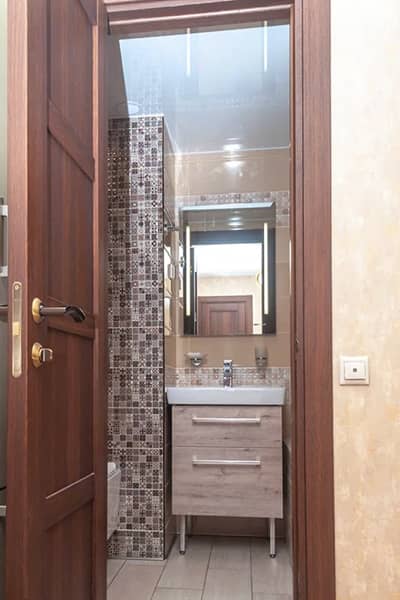 - Придание завершенного вида с помощью установки зеркала и натяжных потолков.
