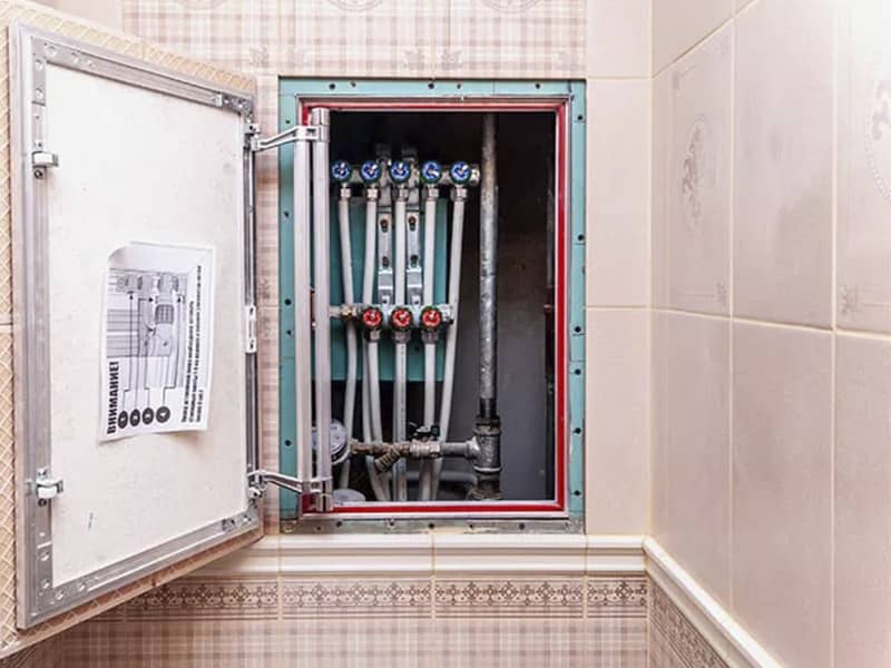 - Проведена прокладка новых труб, установка коллекторов в коробе за унитазом и скрытая прокладка канализации в стенах.